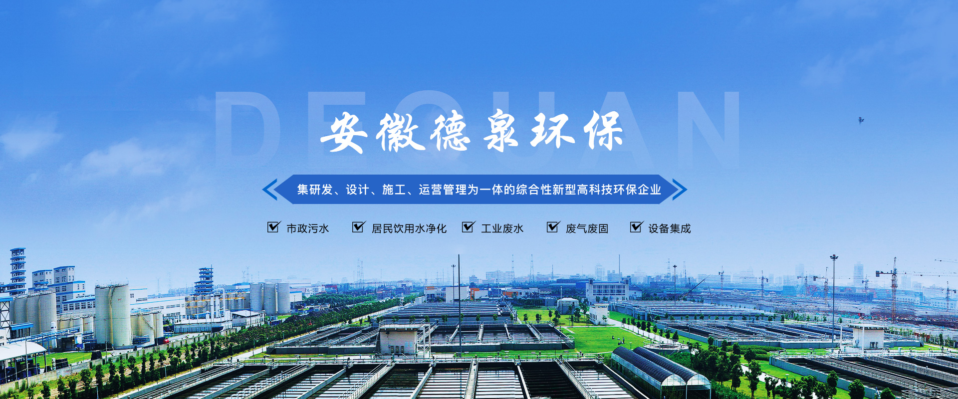 安徽德泉環(huán)保科技有限公司致力于廢水、廢氣、固廢技術(shù)處理研發(fā)、設計、施工及運營管理,從事環(huán)保設備及設施的制造和銷售,為環(huán)保項目系統(tǒng)提供專業(yè)的技術(shù)咨詢和服務。是一家集建筑勞務分包,工程總承包(EPC)、項目投資(BOT/PPP)、運營管理(O&M)于一體的綜合性新型高科技企業(yè)。